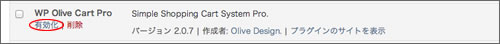 管理画面のメニューの中の、「プラグイン」をクリックします。インストール済みのプラグイン一覧が表示されます。WP Olive Cartの「有効化」をクリックするとWP Olive Cartを使用することが可能になります。